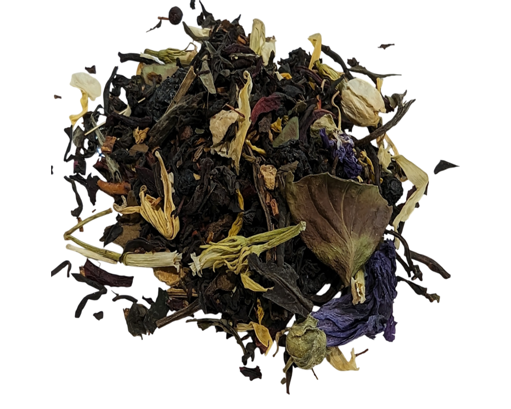 Black, green, oolong and white tea, rooibos, apple, pomegranate, elderberries, black and red currants, pear, calendula, jasmine, mallow, passion flower and hibiscus petals, and natural organic compliant flavours.
