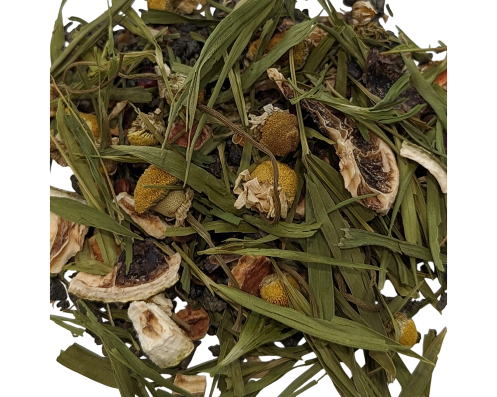 Green tea, lime pieces, chamomile flowers, bamboo leaves, bael nut pieces, sumac.