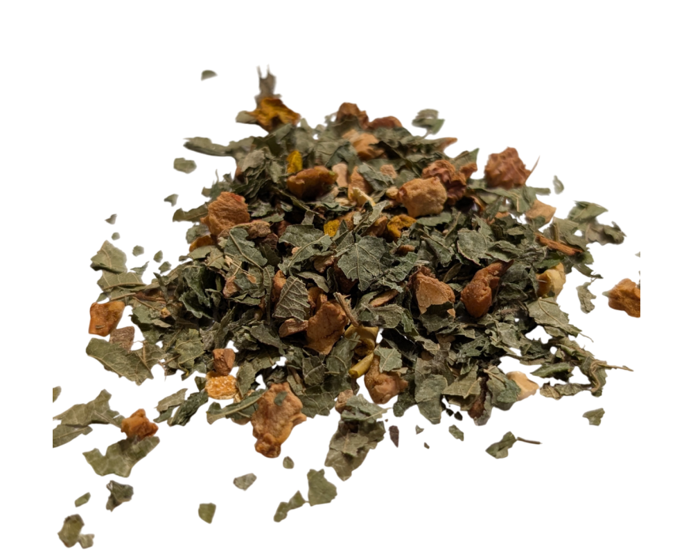 Apple pieces, blackberry leaves, turmeric, ginger, cinnamon, lemon peel, orange peel, cardamom, cloves, natural organic compliant flavours. Caffeine Free.