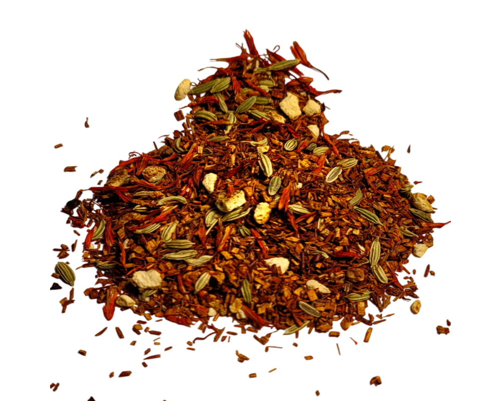Rooibos, fennel, orange peel, safflower, cardamom pods and seeds, natural flavours. Organic. Caffeine free.