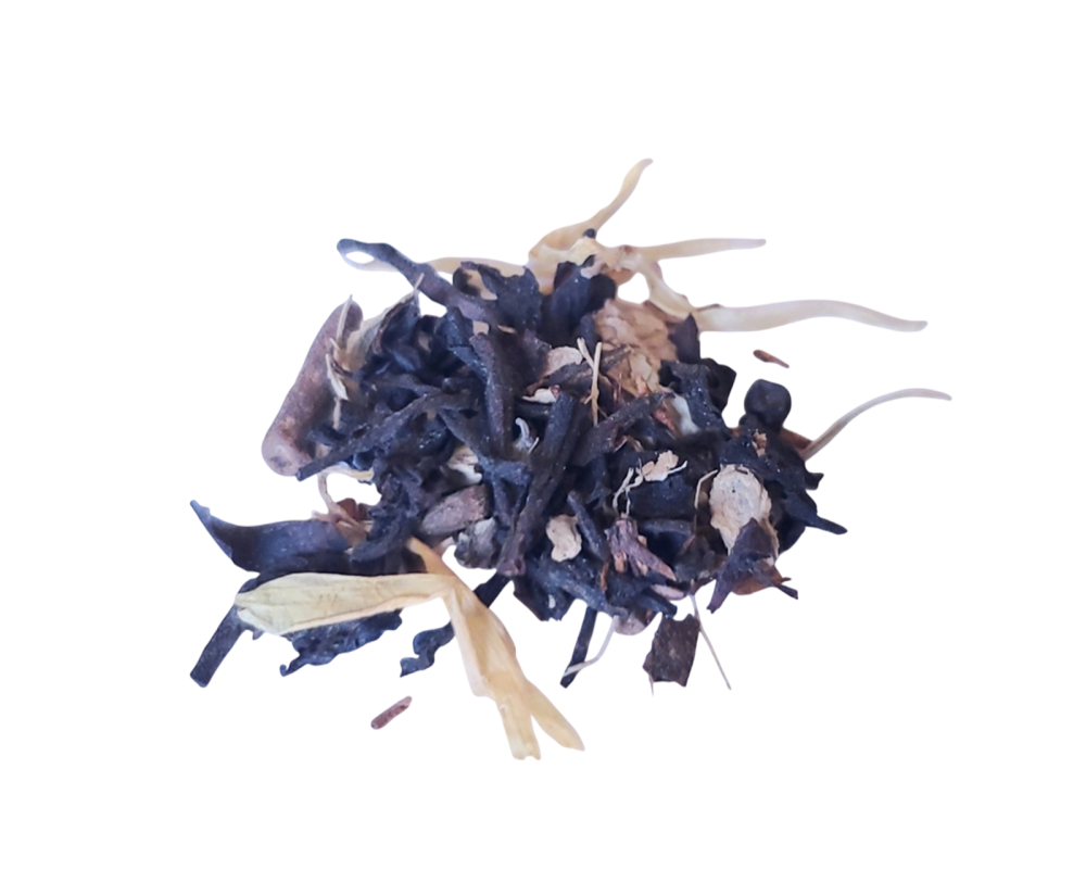 Black tea, honeybush, cardamom, ginger, black and white pepper, cinnamon, clove, nutmeg, chamomile, calendula, sunflower petals, natural flavours.
