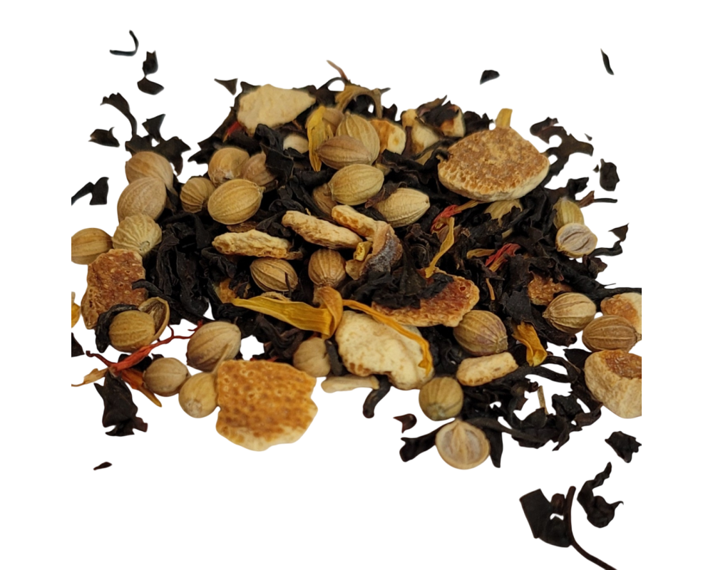Black tea, lime pieces, safflower, cornflower, and sunflower petals, orange peel, coriander seeds, natural organic flavours.