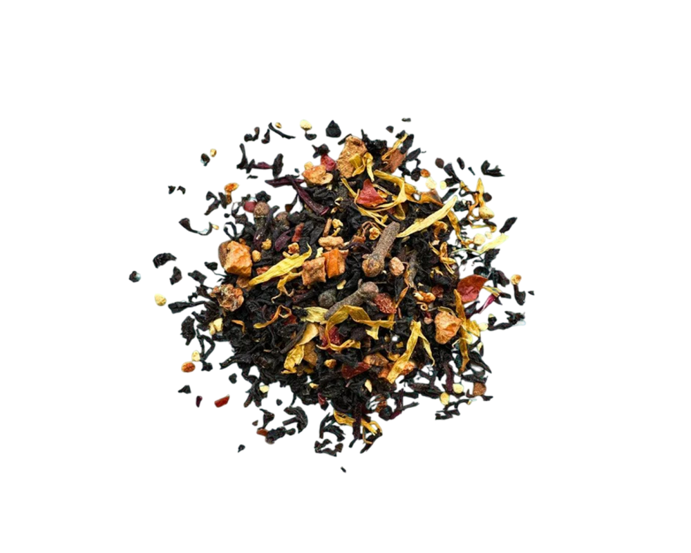 Black tea, apple, pumpkin, and orange pieces, rosehip, hibiscus, calendula and sunflower petals, natural organic flavours.