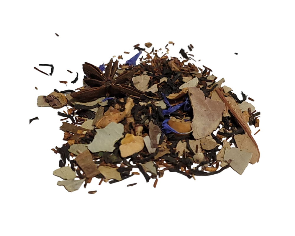 Black tea, rooibos, cinnamon, ginger, cardamom, black and white pepper, clove, nutmeg, star anise, apple pieces, cornflower, linden, and mallow petals, wintergreen, natural organic compliant flavours.