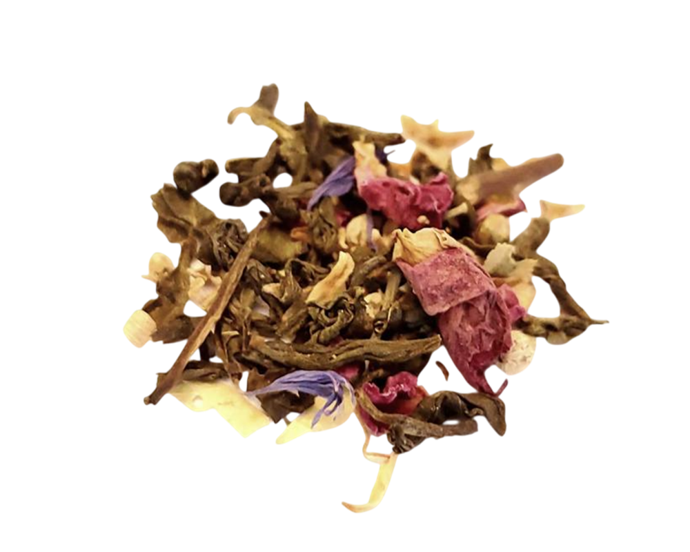 Green tea, sunflower, cornflower, jasmine, osmanthus, rose, linden, safflower and calendula petals.
