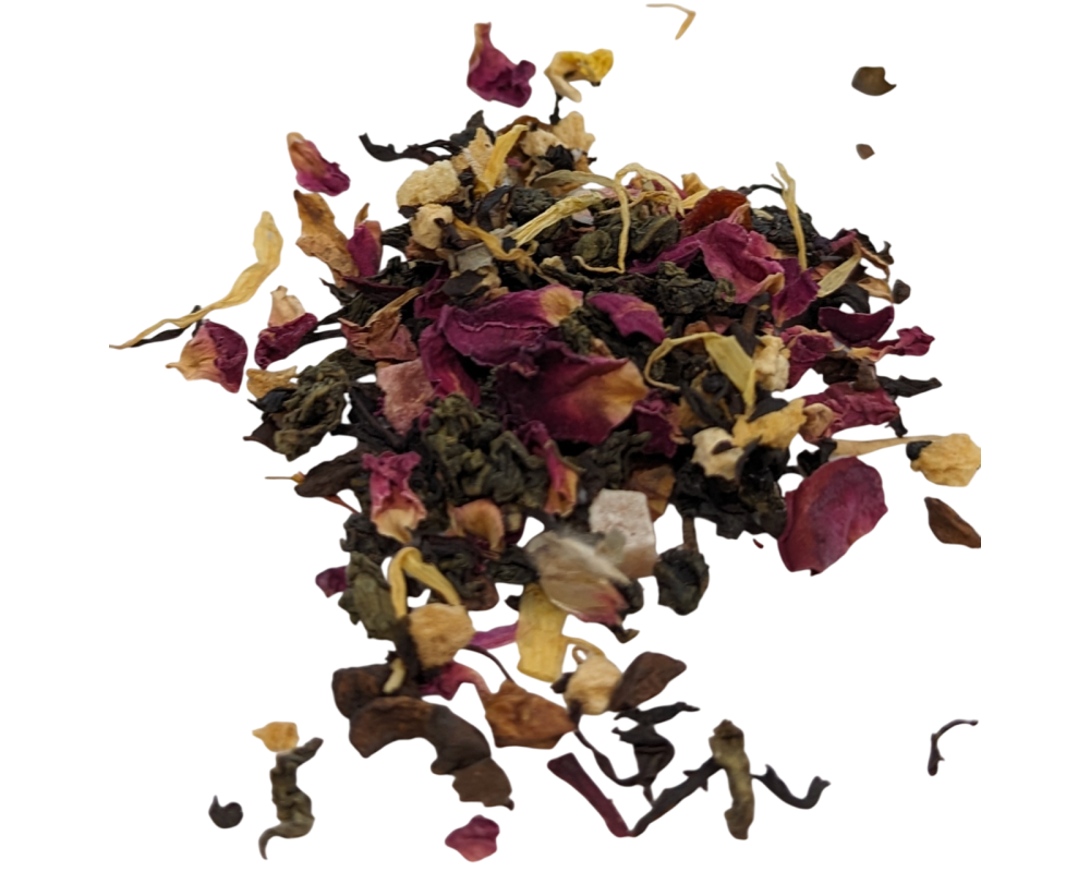 Oolong and black tea, papaya, apricot and peach pieces, blackberry leaves, apple, rosehip, cranberry, elderberry, hibiscus, calendula, plum, rose and safflower petals, chicory, natural organic compliant flavours.