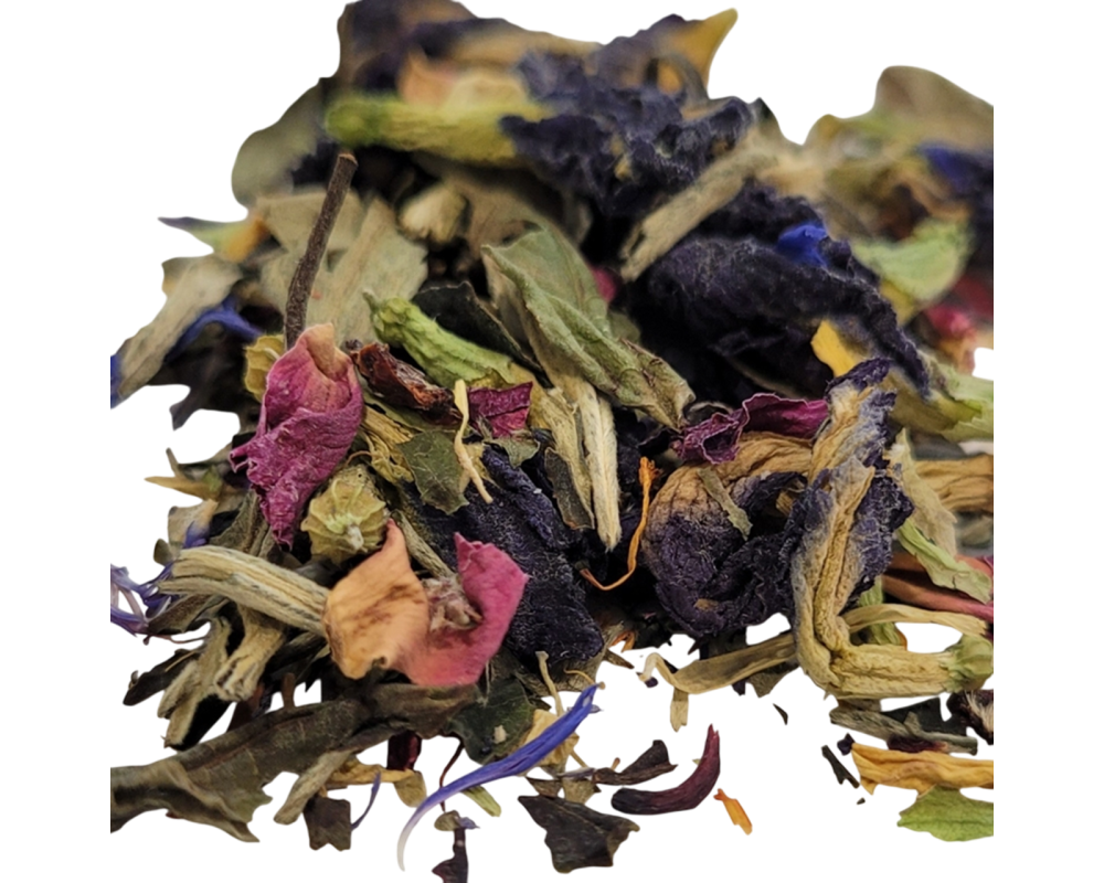 White tea, rosehip pieces, hibiscus, sunflower, cornflower, rose, safflower, calendula, blue pea butterfly flower, and osmanthus petals, natural organic compliant flavours.