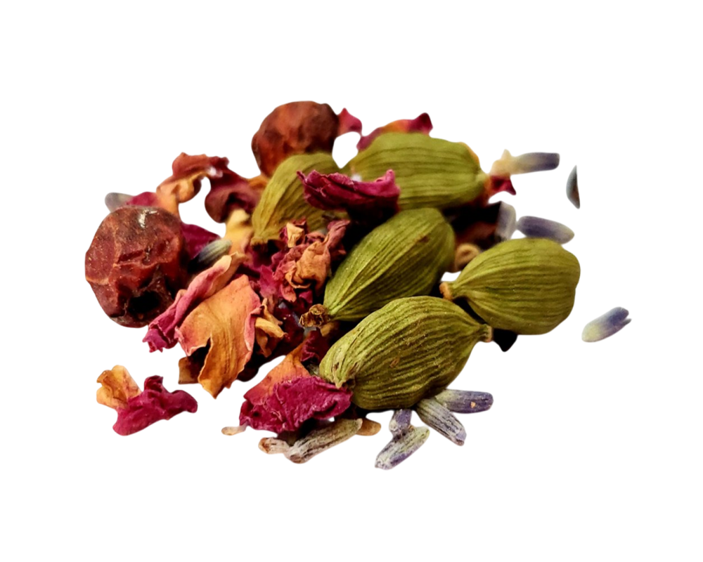 Passionflower, rose, lavender, linden, beet pieces, cardamom, hawthorn berries. Caffeine free.