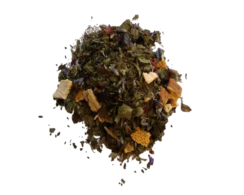 Lemongrass, rosehips, orange peel, lavender, lemon balm. Caffeine free.
