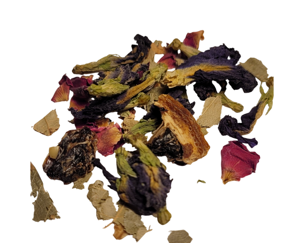 Yerba mate, lemon pieces, rose and blue pea butterfly flower petals.