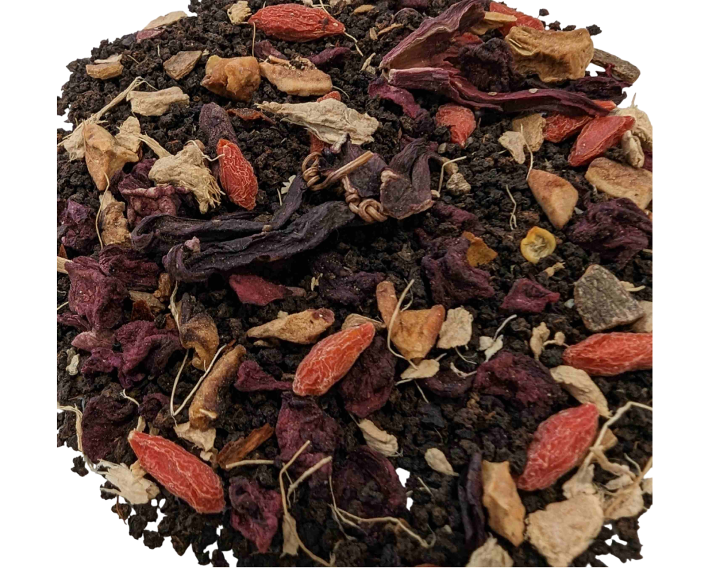 Black tea, ginger, beets, cinnamon, cardamom, hibiscus petals, goji berries, black and white pepper, clove, apple pieces, chili flakes, nutmeg, and Natural flavours.