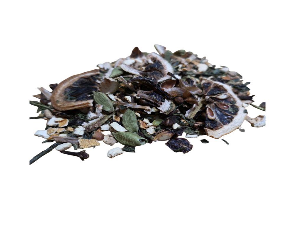 Green tea, lemon and lime pieces, orange peel, ginger, cloves, cardamom.