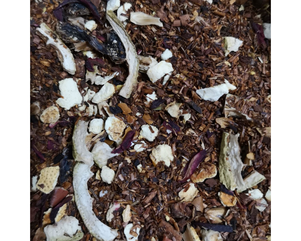 Rooibos, honeybush, orange peel, lime pieces, chili flakes, apple, mango, elderberry, rosehip and pineapple pieces, hibiscus petals, and natural flavours. Caffeine free.