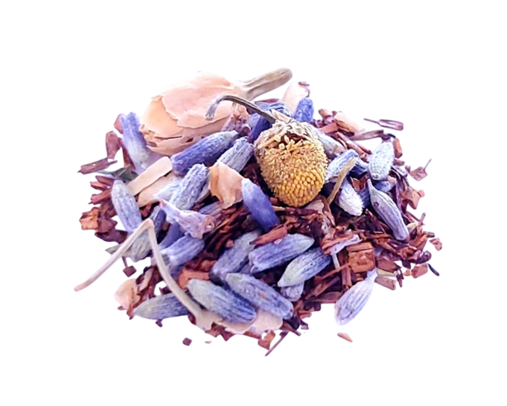 Rooibos, lavender and jasmine flowers. Caffeine free.
