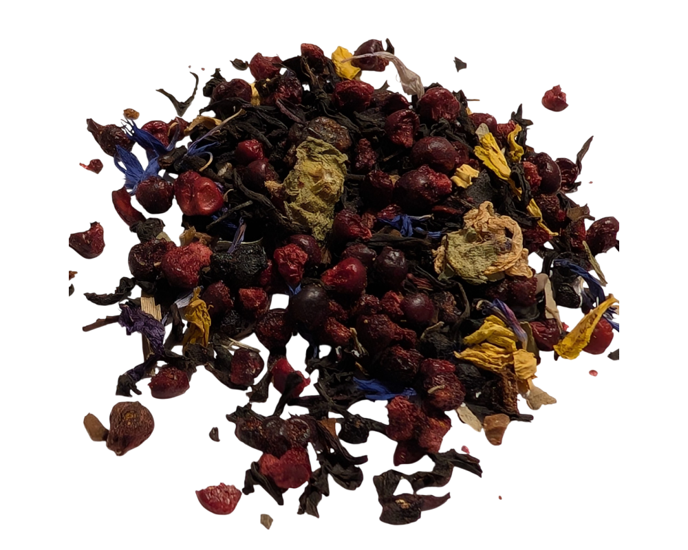 Black tea, elderberry, black and red currants, blackberry leaves and pieces, mallow, hibiscus, cornflower, and sunflower petals, guarana seeds, organic compliant natural flavours.