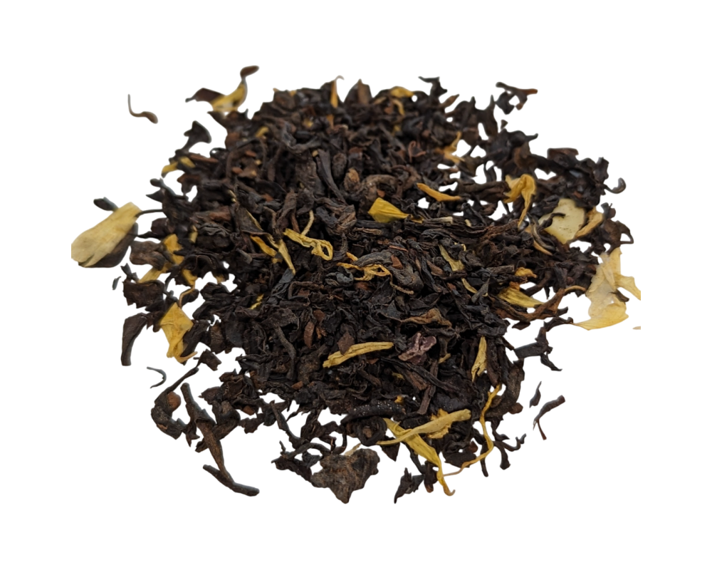 Black tea (estate and pu erh style), almond, coffee and cocoa pieces, calendula and sunflower petals, and natural organic compliant flavours.