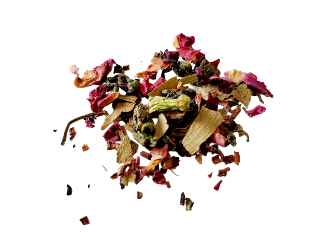 Tags: tea, tisane, honeybush, gynostemma, gingko, rose, blue pea butterfly flower, caffeine free, house blend, alchemical brotherhood