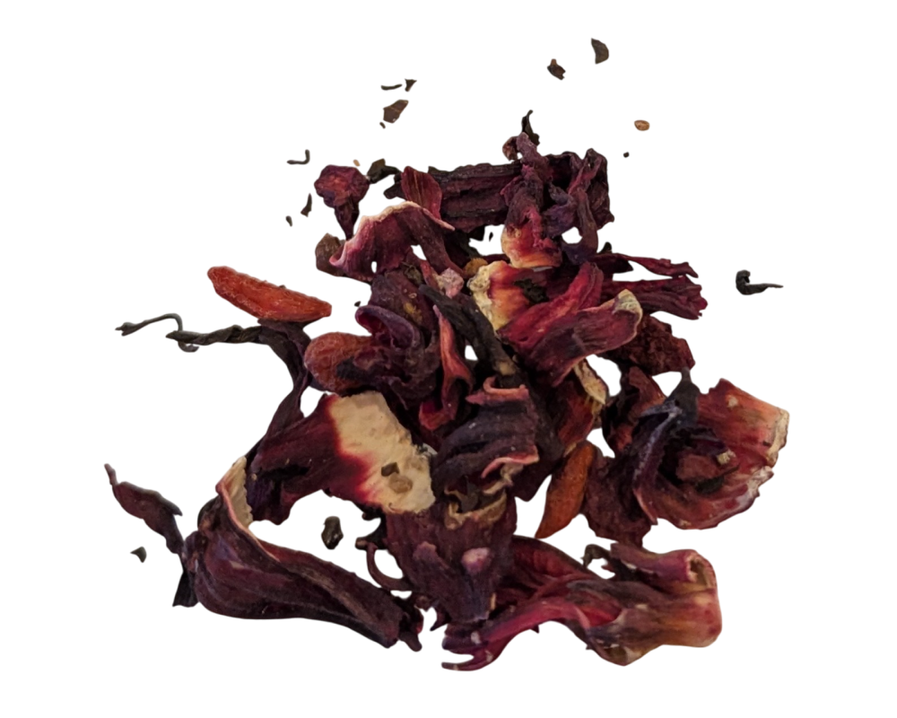Black tea, beet and guarana pieces, hibiscus petals, goji berries.