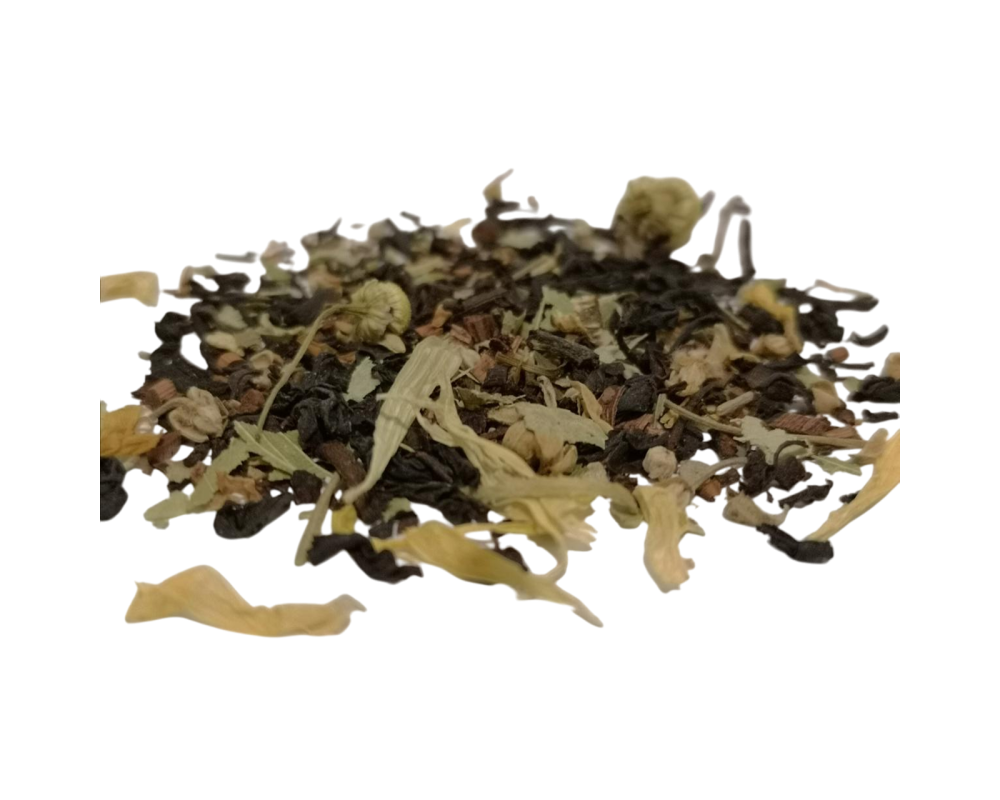 Black tea, honeybush, linden, chamomile, calendula, and sunflower flowers, natural flavours.