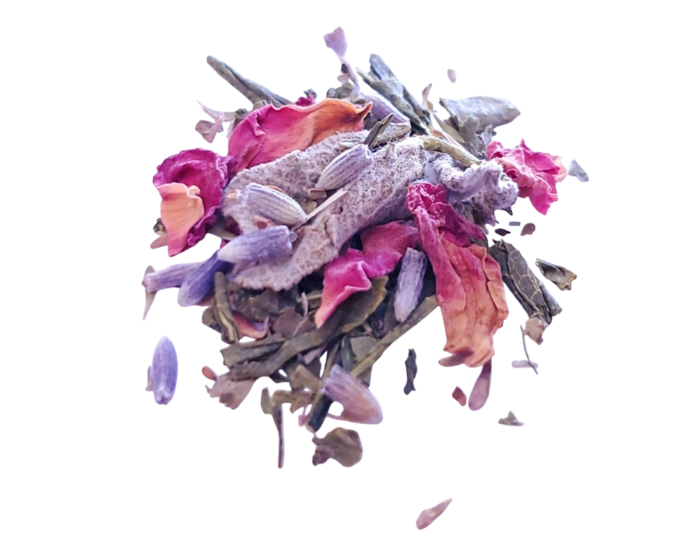 Green tea, lemonbalm, rose, and lavender petals, sage leaves.