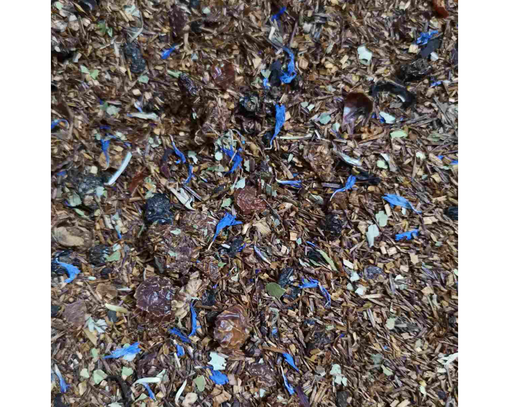 Rooibos, elderberry pieces, raisin pieces, apple pieces, cornflower petals, hibiscus, European blueberries, rosehips, raspberries, currants, blackberry and lime leaves, natural flavours. Caffeine free.