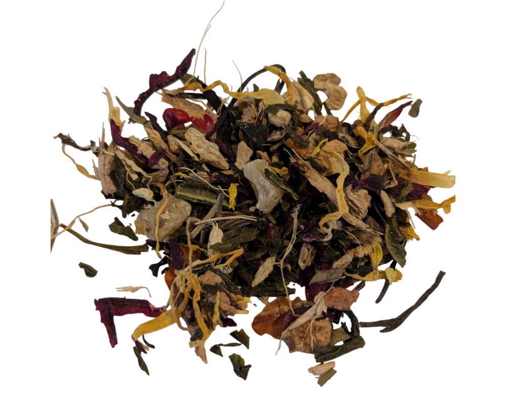 Green tea, Black tea, bael nut, pineapple, ginger pieces, turmeric, red and blue cornflower petals, natural flavours.