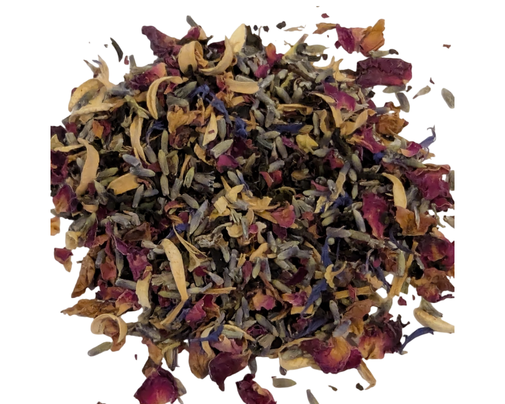 Black tea, green tea, jasmine, lavender, rose, orange blossom and cornflower petals, natural flavours.